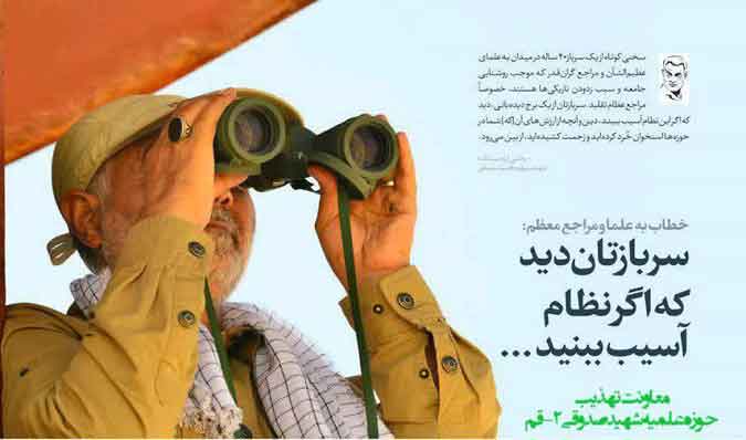 سخنی کوتاه از یک سرباز ۴۰ ساله در میدان به علمای عظیم الشأن و مراجع گرانقدر که موجب روشنایی جامعه و سبب زدودن تاریکیها هستند، خصوصاً مراجع عظام تقلید. سربازتان از یک برج دیده بانی، دید که اگر این نظام آسیب ببیند، دین و آنچه از ارزشهای آن [که] شما در حوزهها استخوان خُرد کرده اید و زحمت کشیده اید، از بین میرود.